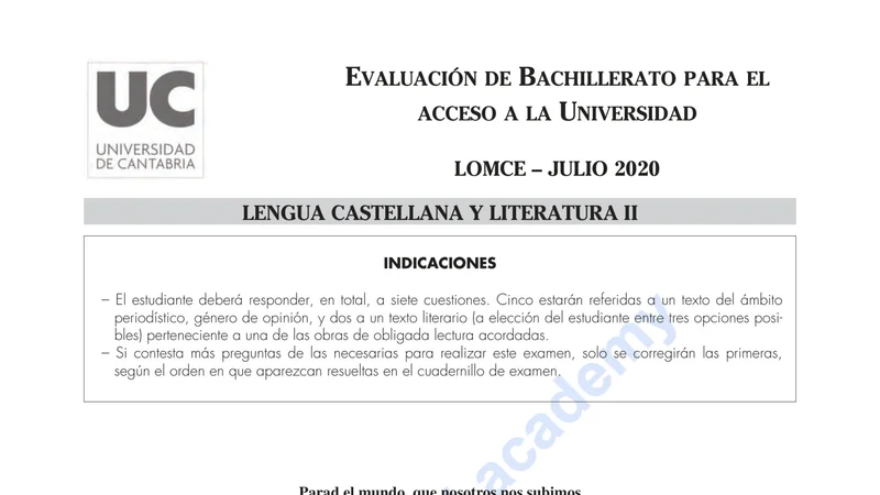 Reservar clase gratis →Examen de Lengua Castellana y Literatura selectividad Cantabria (Ordinaria 2020)