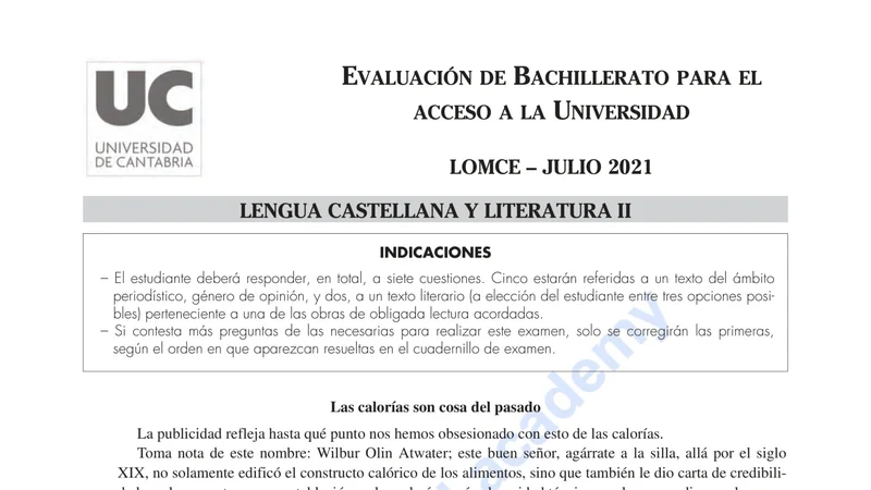 Reservar clase gratis →Examen de Lengua Castellana y Literatura selectividad Cantabria (Extraordinaria 2021)
