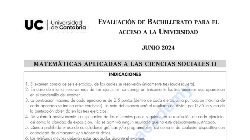 Examen de Matemáticas Aplicadas CCSS selectividad Cantabria — Ordinaria 2024
