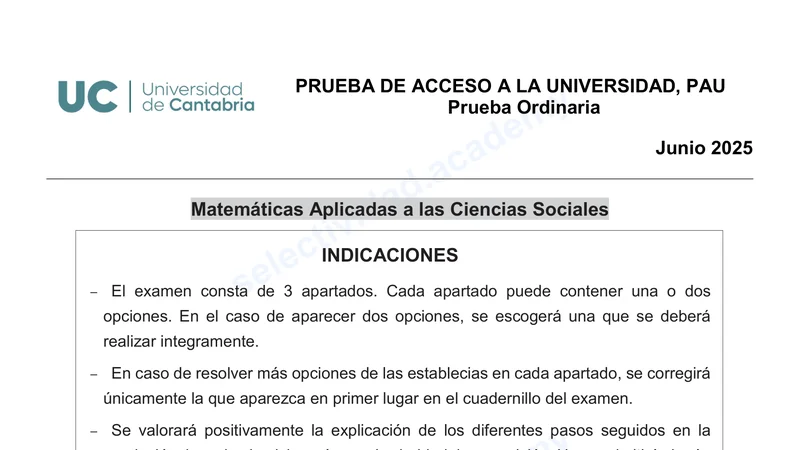 Reservar clase gratis →Examen de Matemáticas Aplicadas CCSS selectividad Cantabria (Ordinaria 2025)
