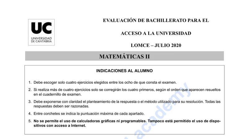 Reservar clase gratis →Examen de Matemáticas II selectividad Cantabria (Ordinaria 2020)