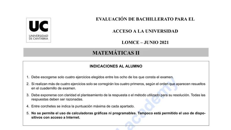 Examen de Matemáticas II selectividad Cantabria — Ordinaria 2021