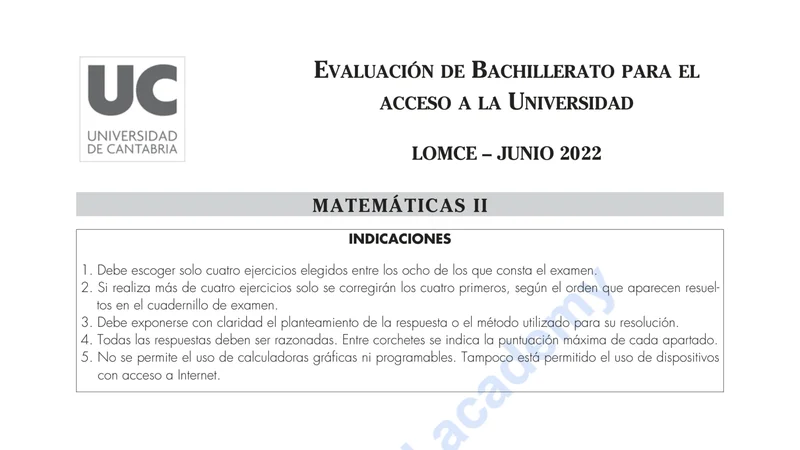 Examen de Matemáticas II selectividad Cantabria — Ordinaria 2022