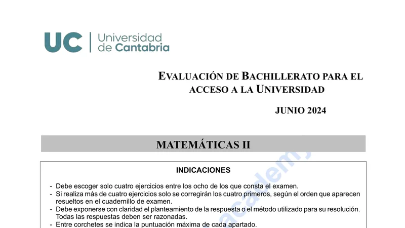 Reservar clase gratis →Examen de Matemáticas II selectividad Cantabria (Ordinaria 2024)