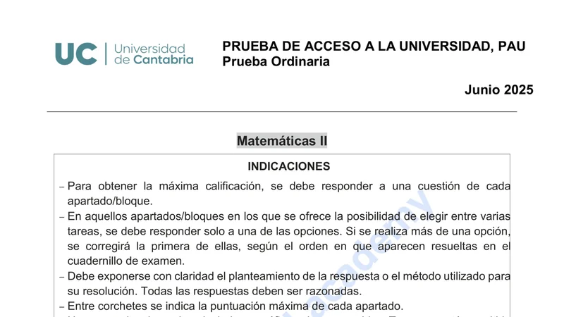 Examen de Matemáticas II selectividad Cantabria — Ordinaria 2025