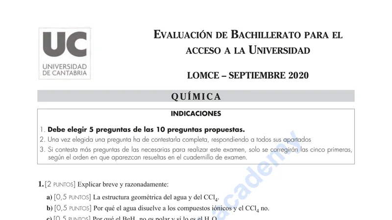 Reservar clase gratis →Examen de Química selectividad Cantabria (Extraordinaria 2020)