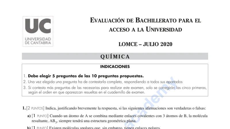 Examen de Química selectividad Cantabria — Ordinaria 2020