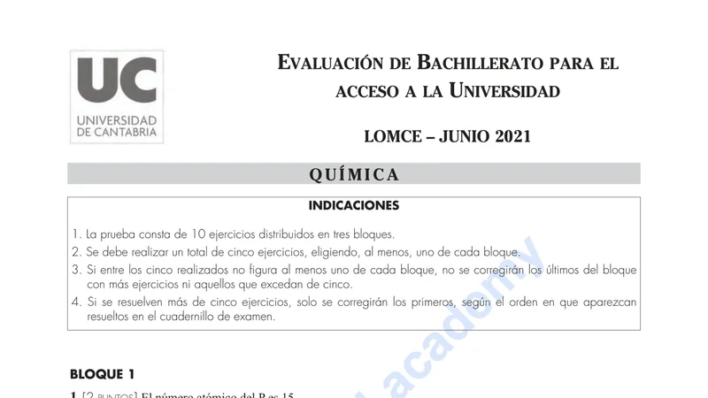 Enunciado oficial del examen de Química de la convocatoria ordinaria de 2021 de la EBAU/PAU de Cantabria. PDF de 0.0 MB. Descarga gratuita y sin registro. ¿Preparando la selectividad? Calcula tu nota estimada o consulta la guía completa de selectividad 2026. Encuentra todos los exámenes de Química en Cantabria o explora las 17 comunidades autónomas.
