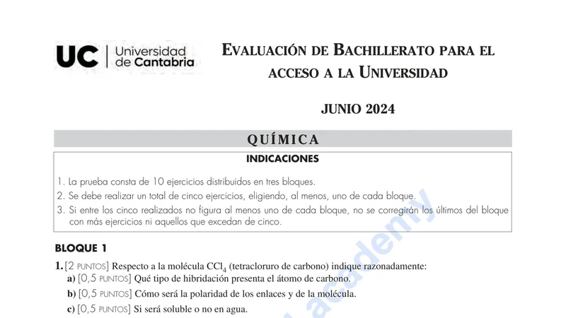 Examen de Química selectividad Cantabria — Ordinaria 2024