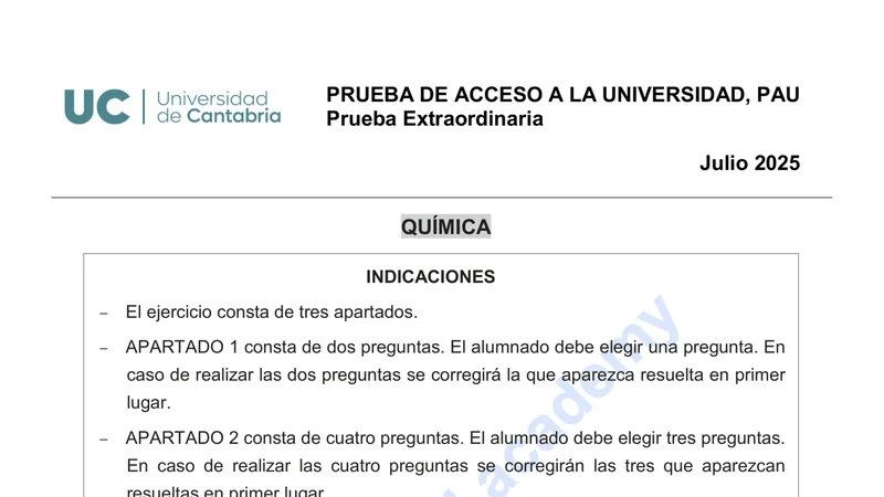 Examen PAU Química selectividad Cantabria — Extraordinaria 2025