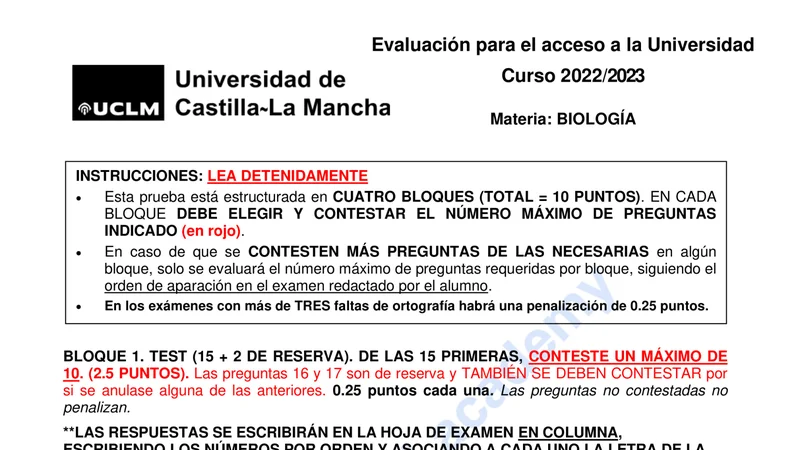 Reservar clase gratis →Examen de Biología selectividad Castilla-La Mancha (Ordinaria 2023)