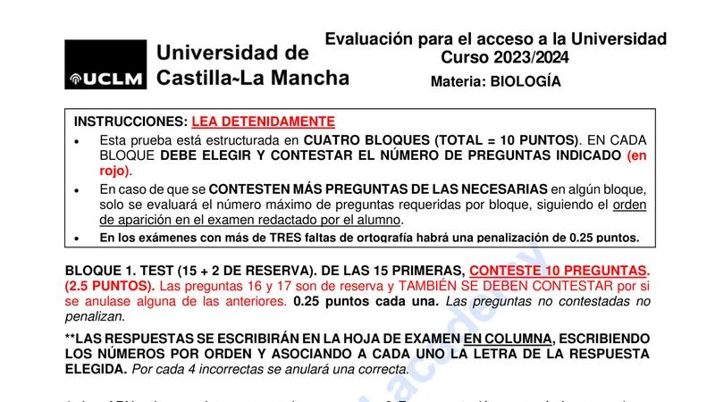 Examen de Biología selectividad Castilla-La Mancha — Extraordinaria 2024