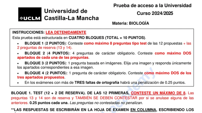 Reservar clase gratis →Examen de Biología selectividad Castilla-La Mancha (Ordinaria 2025)
