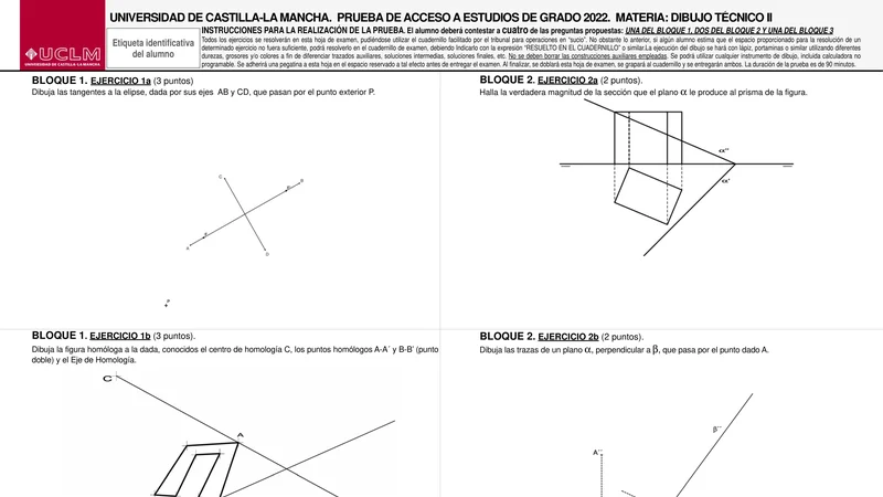 Enunciado oficial del examen de Dibujo Técnico II de la convocatoria extraordinaria de 2022 de la EvAU/PAU de Castilla-La Mancha. PDF de 0.2 MB. Descarga gratuita y sin registro. ¿Preparando la selectividad? Calcula tu nota estimada o consulta la guía completa de selectividad 2026. Encuentra todos los exámenes de Dibujo Técnico II en Castilla-La Mancha o explora las 17 comunidades autónomas.