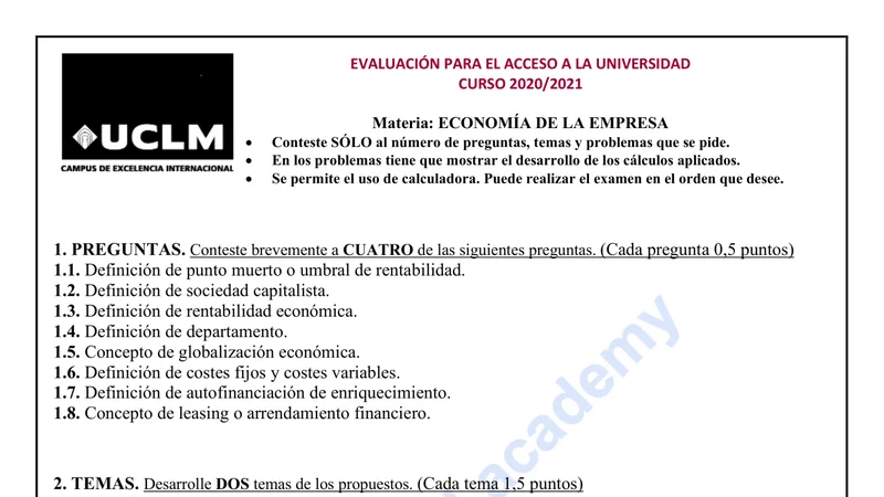 Reservar clase gratis →Examen de Economía selectividad Castilla-La Mancha (Ordinaria 2021)