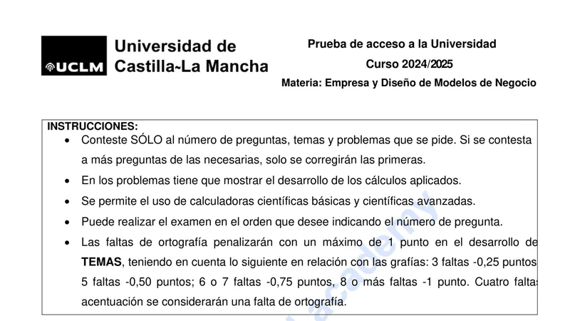 Enunciado oficial del examen de Economía de la Empresa de la convocatoria extraordinaria de 2025 de la EvAU/PAU de Castilla-La Mancha. PDF de 0.1 MB. Descarga gratuita y sin registro. ¿Preparando la selectividad? Calcula tu nota estimada o consulta la guía completa de selectividad 2026. Encuentra todos los exámenes de Economía de la Empresa en Castilla-La Mancha o explora las 17 comunidades autónomas.