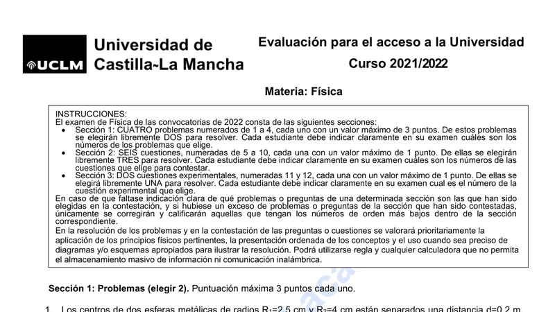 Examen PAU Física selectividad Castilla-La Mancha — Ordinaria 2022