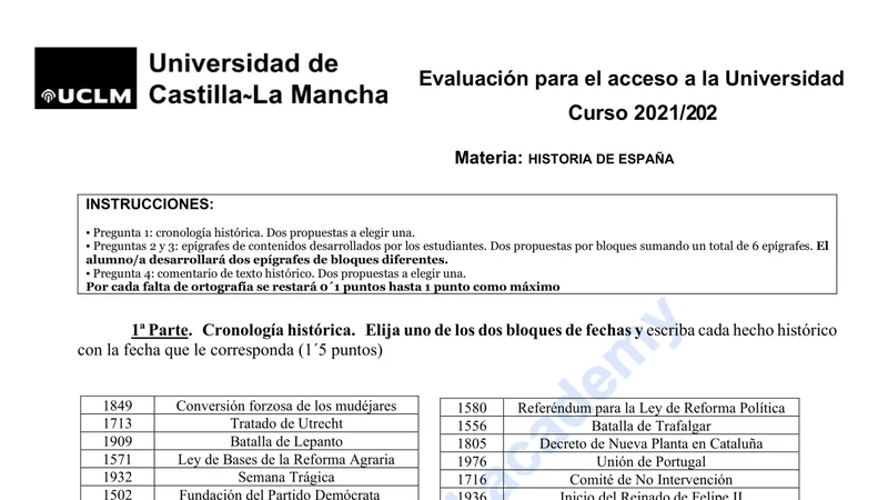 Reservar clase gratis →Examen de Historia de España selectividad Castilla-La Mancha (Ordinaria 2022)