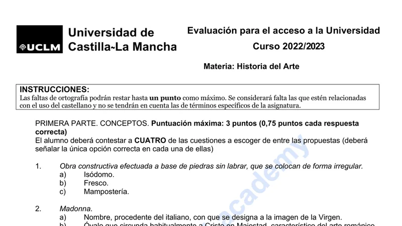 Reservar clase gratis →Examen de Historia del Arte selectividad Castilla-La Mancha (Ordinaria 2023)