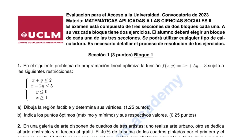 Reservar clase gratis →Examen de Matemáticas CCSS selectividad Castilla-La Mancha (Ordinaria 2023)