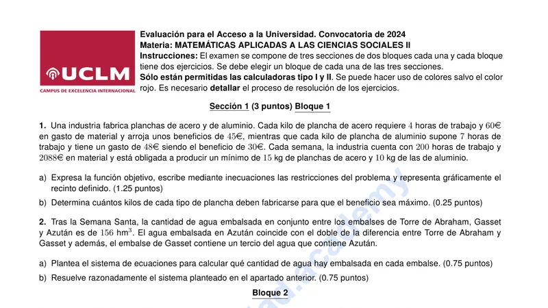 Reservar clase gratis →Examen de Matemáticas Aplicadas CCSS selectividad Castilla-La Mancha (Extraordinaria 2024)
