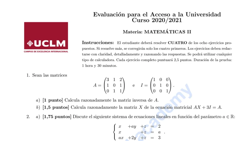 Reservar clase gratis →Examen de Matemáticas II selectividad Castilla-La Mancha (Ordinaria 2021)