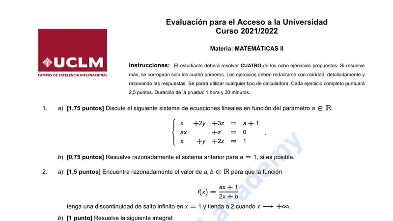 Reservar clase gratis →Examen de Matemáticas II selectividad Castilla-La Mancha (Ordinaria 2022)