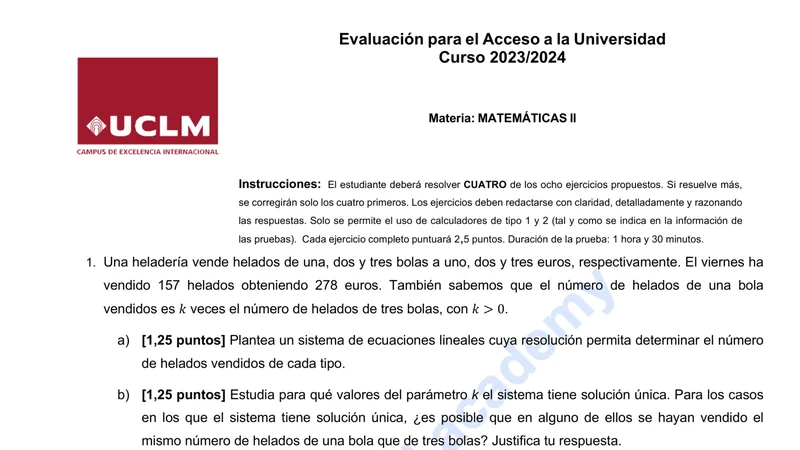 Examen de Matemáticas II selectividad Castilla-La Mancha — Extraordinaria 2024