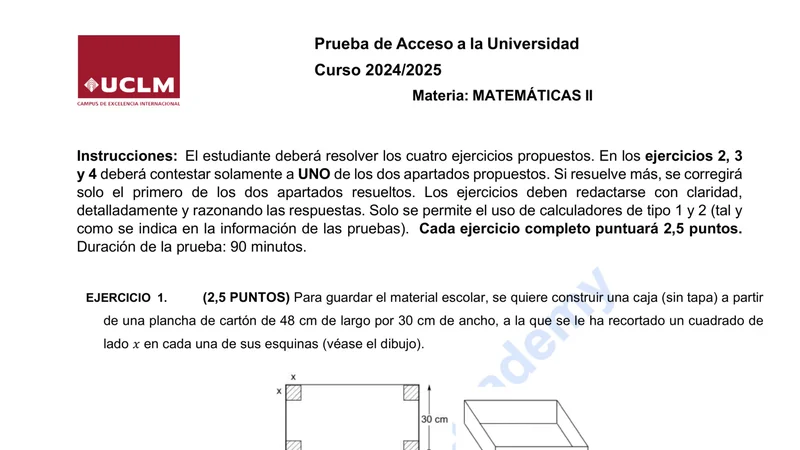 Enunciado oficial del examen de Matemáticas II de la convocatoria extraordinaria de 2025 de la EvAU/PAU de Castilla-La Mancha. PDF de 0.1 MB. Descarga gratuita y sin registro. ¿Preparando la selectividad? Calcula tu nota estimada o consulta la guía completa de selectividad 2026. Encuentra todos los exámenes de Matemáticas II en Castilla-La Mancha o explora las 17 comunidades autónomas.