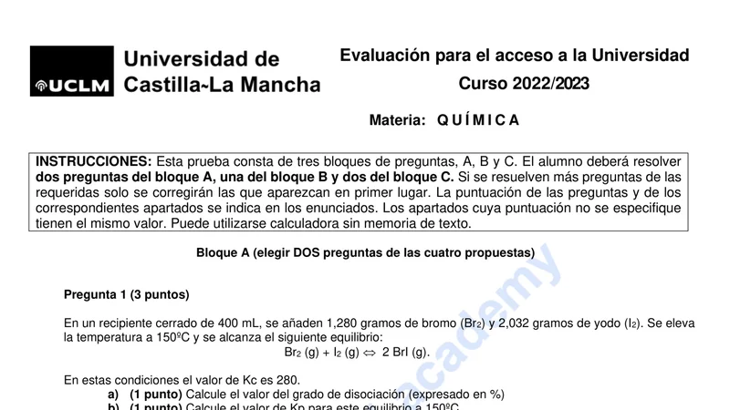 Reservar clase gratis →Examen de Química selectividad Castilla-La Mancha (Ordinaria 2023)