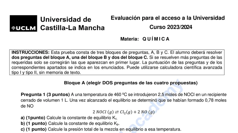 Reservar clase gratis →Examen de Química selectividad Castilla-La Mancha (Ordinaria 2024)
