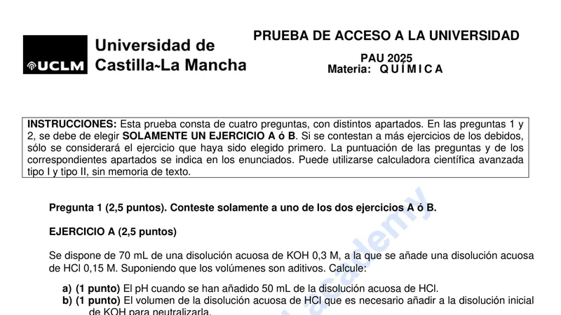 Reservar clase gratis →Examen de Química selectividad Castilla-La Mancha (Ordinaria 2025)