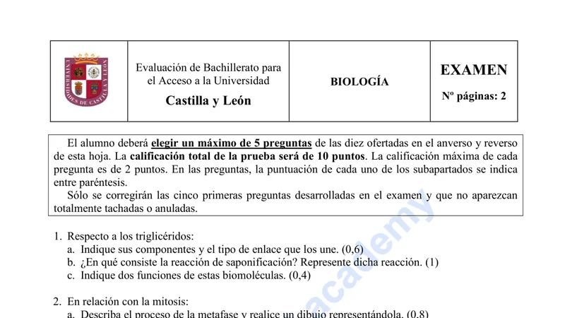 Reservar clase gratis →Examen de Biología selectividad Castilla y León (Ordinaria 2023)