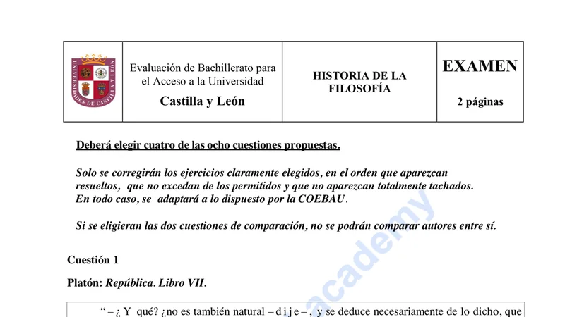 Examen de Historia de la Filosofía selectividad Castilla y León — Ordinaria 2020