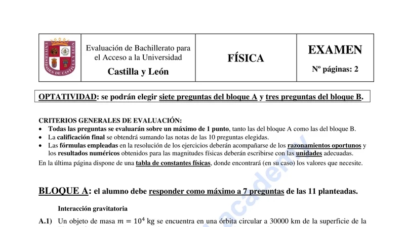 Reservar clase gratis →Examen de Física selectividad Castilla y León (Ordinaria 2021)