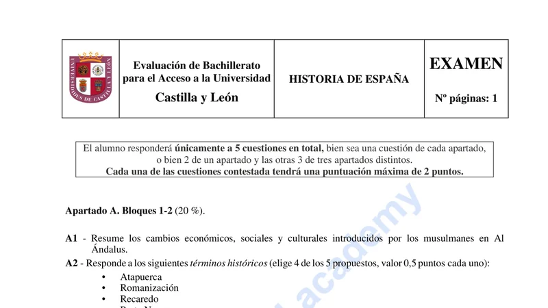 Reservar clase gratis →Examen de Historia de España selectividad Castilla y León (Extraordinaria 2020)