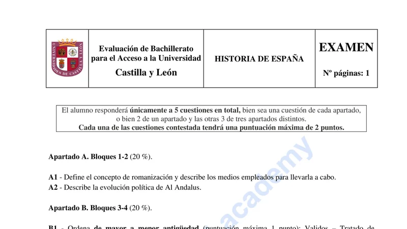 Reservar clase gratis →Examen de Historia de España selectividad Castilla y León (Ordinaria 2020)