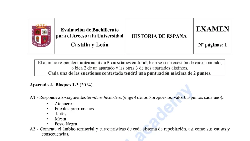 Reservar clase gratis →Examen de Historia de España selectividad Castilla y León (Ordinaria 2021)