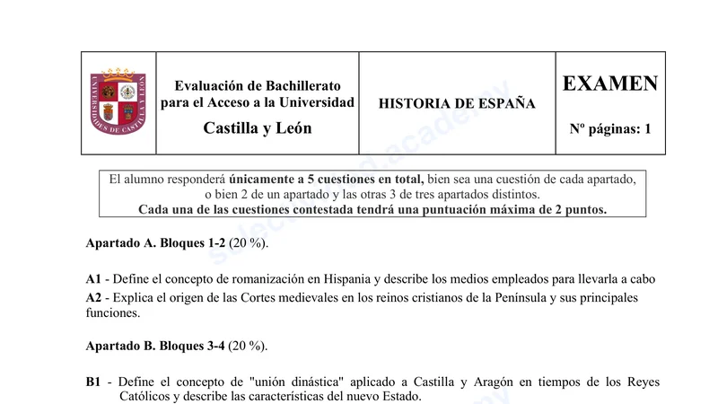 Reservar clase gratis →Examen de Historia de España selectividad Castilla y León (Extraordinaria 2022)