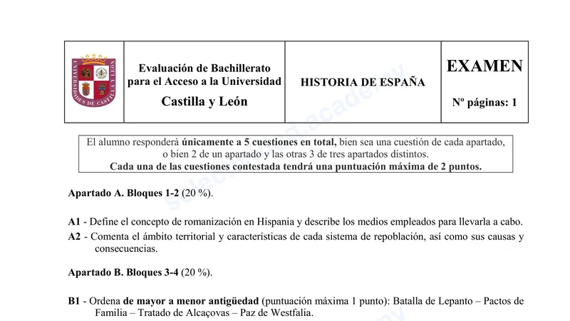 Reservar clase gratis →Examen de Historia de España selectividad Castilla y León (Extraordinaria 2023)