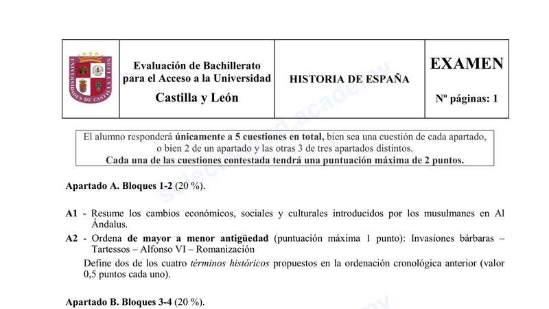 Reservar clase gratis →Examen de Historia de España selectividad Castilla y León (Ordinaria 2023)