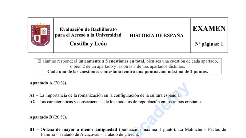 Reservar clase gratis →Examen de Historia de España selectividad Castilla y León (Ordinaria 2024)