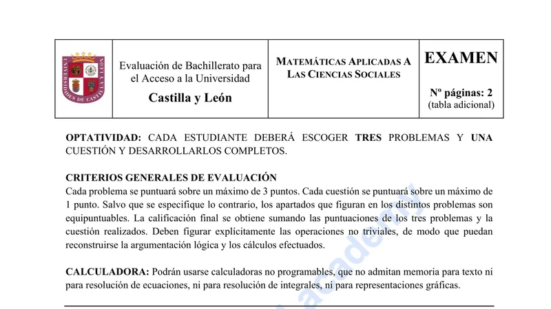Enunciado oficial del examen de Matemáticas CCSS de la convocatoria extraordinaria de 2023 de la EBAU/PAU de Castilla y León. PDF de 0.2 MB. Descarga gratuita y sin registro. ¿Preparando la selectividad? Calcula tu nota estimada o consulta la guía completa de selectividad 2026. Encuentra todos los exámenes de Matemáticas CCSS en Castilla y León o explora las 17 comunidades autónomas.