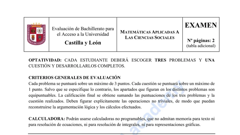 Enunciado oficial del examen de Matemáticas CCSS de la convocatoria ordinaria de 2023 de la EBAU/PAU de Castilla y León. PDF de 0.2 MB. Descarga gratuita y sin registro. ¿Preparando la selectividad? Calcula tu nota estimada o consulta la guía completa de selectividad 2026. Encuentra todos los exámenes de Matemáticas CCSS en Castilla y León o explora las 17 comunidades autónomas.