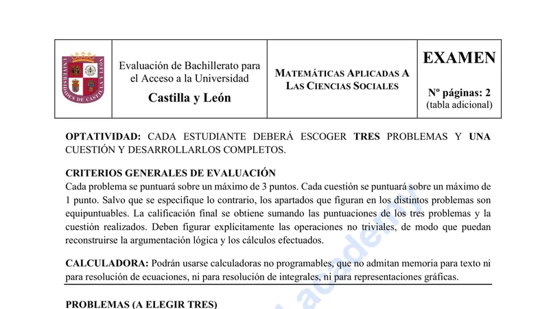 Examen PAU Matemáticas CCSS selectividad Castilla y León — Ordinaria 2024