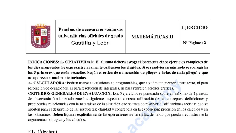 Enunciado oficial del examen de Matemáticas II de la convocatoria ordinaria de 2022 de la EBAU/PAU de Castilla y León. PDF de 0.2 MB. Descarga gratuita y sin registro. ¿Preparando la selectividad? Calcula tu nota estimada o consulta la guía completa de selectividad 2026. Encuentra todos los exámenes de Matemáticas II en Castilla y León o explora las 17 comunidades autónomas.