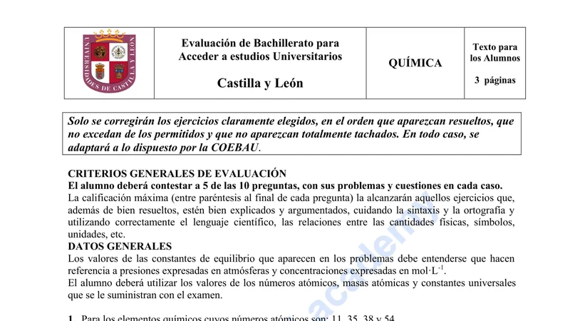 Reservar clase gratis →Examen de Química selectividad Castilla y León (Ordinaria 2022)