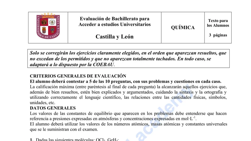 Enunciado oficial del examen de Química de la convocatoria extraordinaria de 2023 de la EBAU/PAU de Castilla y León. PDF de 0.6 MB. Descarga gratuita y sin registro. ¿Preparando la selectividad? Calcula tu nota estimada o consulta la guía completa de selectividad 2026. Encuentra todos los exámenes de Química en Castilla y León o explora las 17 comunidades autónomas.