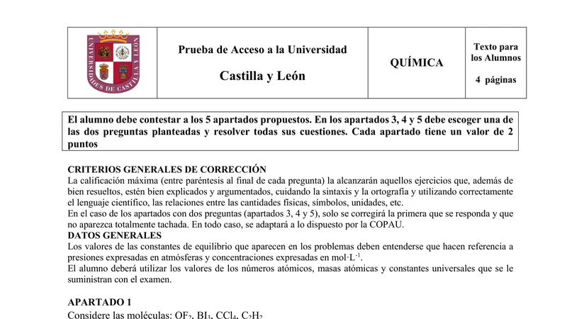 Enunciado oficial del examen de Química de la convocatoria ordinaria de 2025 de la EBAU/PAU de Castilla y León. PDF de 0.4 MB. Descarga gratuita y sin registro. ¿Preparando la selectividad? Calcula tu nota estimada o consulta la guía completa de selectividad 2026. Encuentra todos los exámenes de Química en Castilla y León o explora las 17 comunidades autónomas.