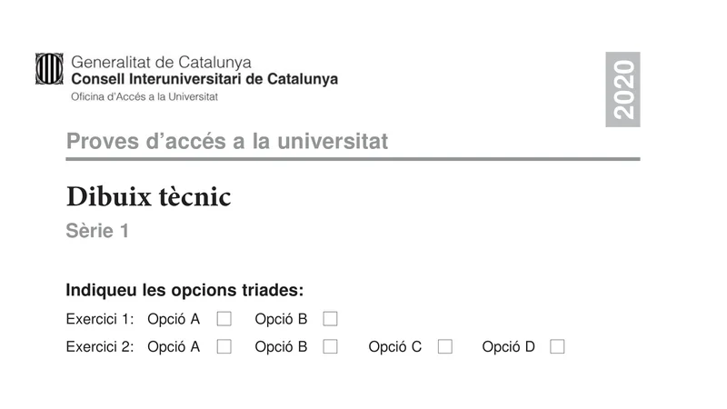 Enunciado oficial del examen de Dibujo Técnico II de la convocatoria ordinaria de 2020 de la PAU de Cataluña. PDF de 0.3 MB. Descarga gratuita y sin registro. ¿Preparando la selectividad? Calcula tu nota estimada o consulta la guía completa de selectividad 2026. Encuentra todos los exámenes de Dibujo Técnico II en Cataluña o explora las 17 comunidades autónomas.
